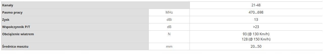 - Ponadto, wyposażona jest w filtr z wysoką separacją pasm wyższych niż kanał 48, bez wpływu na równomierność charakterystyki częstotliwości w paśmie przepustowym (kanały 21-48). Antena przystosowana do Drugiej Dywidendy Cyfrowej (LTE700).